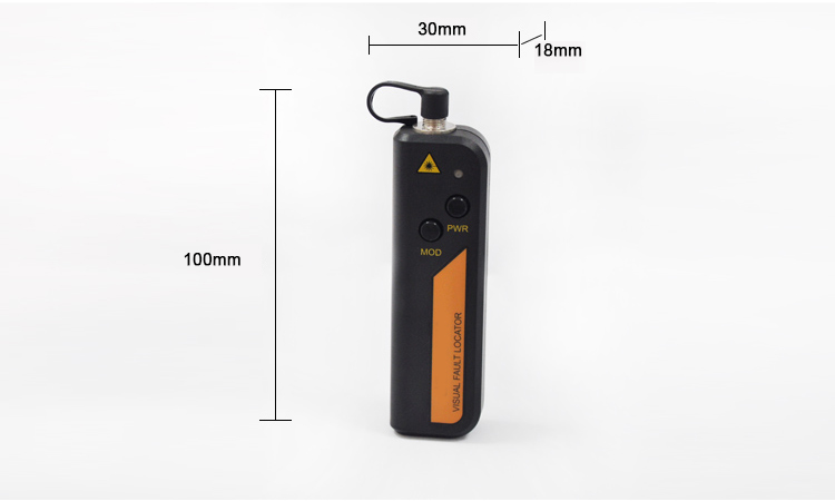 Localisateur Visuel de Défaut - Style Stylo  VFL-105N est un outil de test compact mais puissant pour le câble à fibre optique, avec une puissance de sortie jusqu'à 10mW, qui peut être utilisé pour localiser des pliages et des ruptures pointus dans les fibres gainées ou nues de plus de 8-10km. Il peut également être appliqué pour identifier les connecteurs dans les panneaux de brassage et identifier les fibres lors de l'opération d'épissure. Choisissez le mode de sortie d'onde continue pour une illumination de défaut stable ou le mode de sortie flashing pour une localisation de défaut plus facile.
